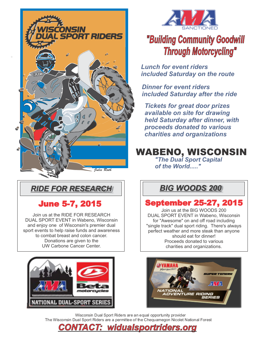 The Wisconsin Dual Sports Riders Club is sanctioned by the AMA (American Motorcyclist Association) www.americanmotorcyclist.com. AMA is a 100 year old organization dedicated to promoting motorcycling. The Wisconsin Dual Sports Club has two major events in Wabeno each year; the Ride for Research and the Big Woods 200 Ride. Wabeno has been deemed the Dual Sports Riders Capital of the World!